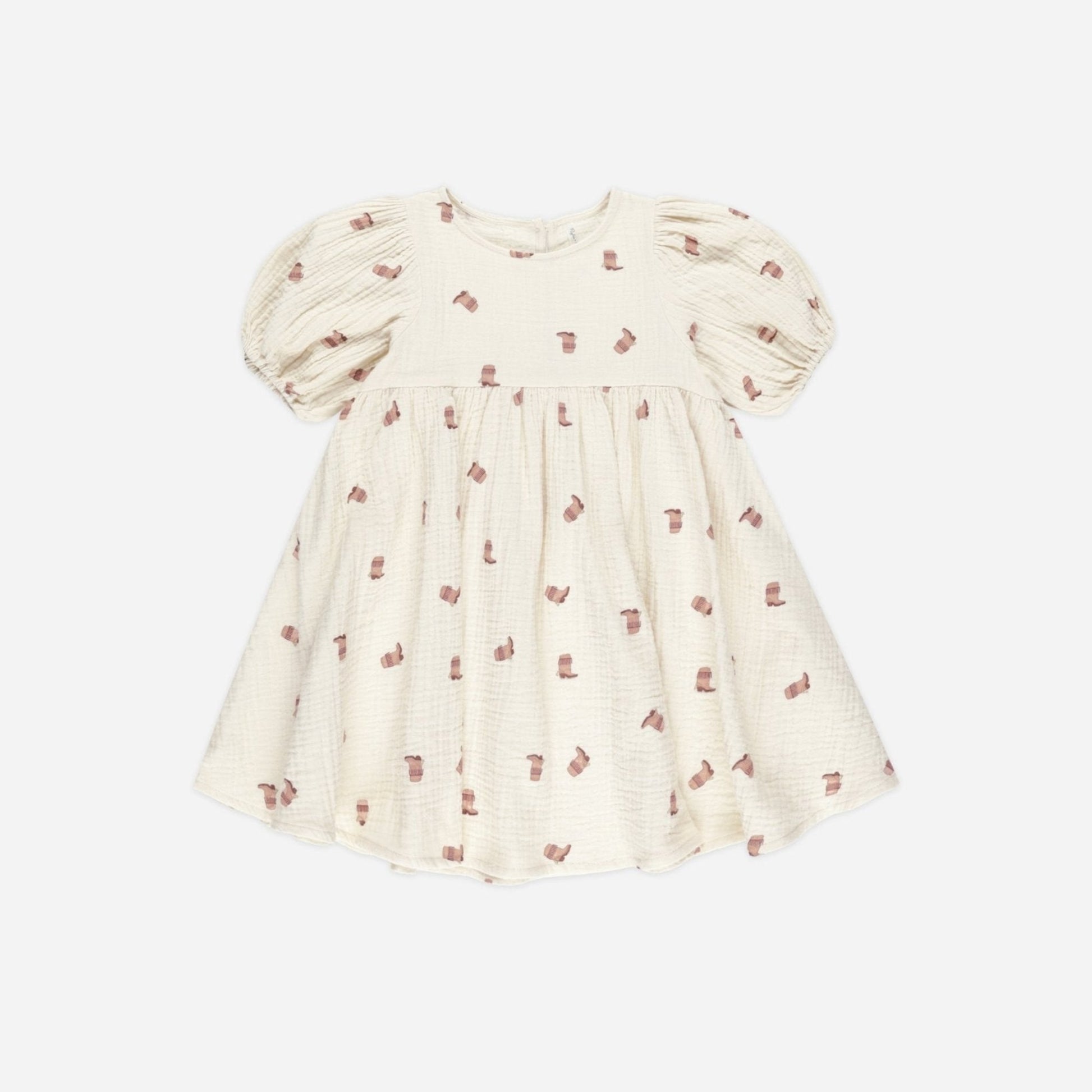 Cette adorable robe présente de jolies manches bouffantes et une silhouette inspirée des robes de poupée, avec une taille cintrée. Encolure ronde et fermeture boutonnée au dos.